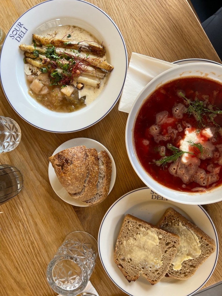 pork borscht, white asparagus w/ whipped goat cheese and hazelnuts